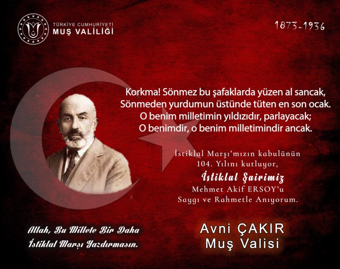 Muş Valisi Avni Çakır, İstiklal Marşı’nın kabulü ve Mehmet Akif Ersoy’u Anma Günü dolayısıyla bir mesaj yayımladı. Vali Çakır, "Millî mücadelemizin en çetin döneminde, şanlı ecdadımızın yeniden dirilişini, aziz milletimizin asil ruhunu en güzel şekilde ifade eden ve ölümsüzleştiren İstiklal Marşımız, milletimizin inancının ve vicdanının ortak sesi, yenilmez azminin destanıdır," dedi.