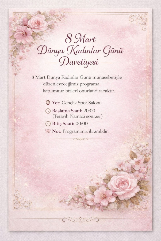 “8 Mart Dünya Kadınlar Günü vesilesiyle düzenleyeceğimiz programımıza tüm kadınlarımızı bekliyoruz. Bu anlamlı günde bir araya gelerek dayanışmamızı güçlendirmek, kadınlarımızın toplumdaki değerini bir kez daha vurgulamak istiyoruz. Katılım sağlayacak tüm misafirlerimiz bizleri onurlandıracaktır.”
