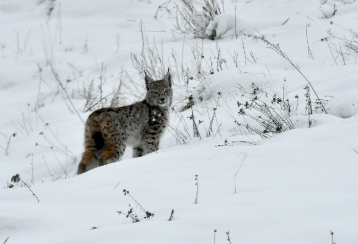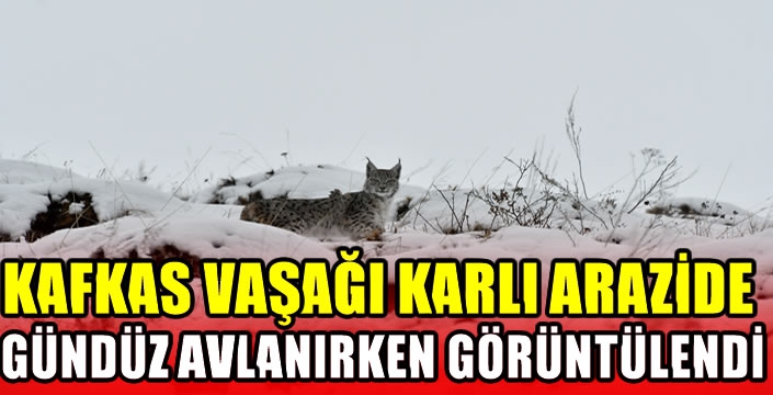 Gece avlandığı gündüz de dinlendiği için nadir görülen ve "ormanın hayaleti" olarak adlandırılan Kafkas vaşağının, sarıçam ormanlarında karla kaplı arazide avlandığı görüntülendi.