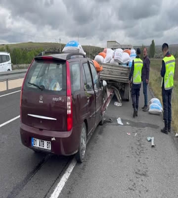 Çarpışmanın şiddetiyle bazı yem torbalarının etrafa savrulduğu kazada, sürücü Z.I. ile otomobildeki A.I. ve S.I. yaralandı.