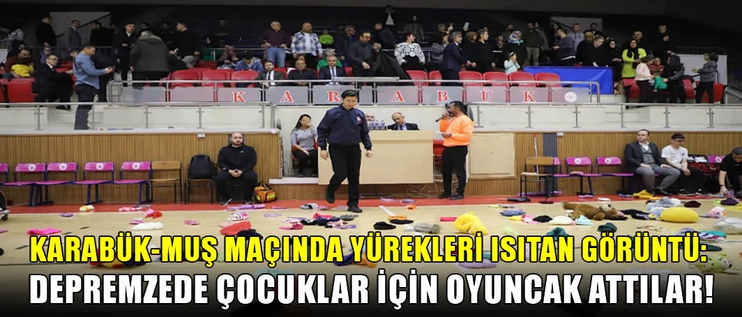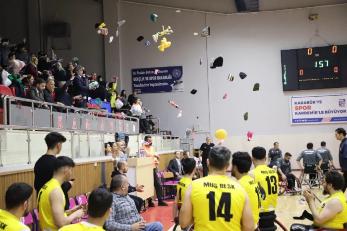 ALPARSLAN DİYARI- Türkiye Basketbol Federasyonunun düzenlediği “Her oyuncak mutlu bir çocuk” projesi çerçevesinde Karabük Demirkartal Gençlik ve Spor Kulübü ile Muş Bedensel Engelli Spor Kulübü arasında oynanan mücadele öncesinde depremzede çocukların yeni yıla bir nebze de olsa mutlu girebilmeleri adına sporseverler parkeyi pelüş oyuncak yağmuruna tuttu.