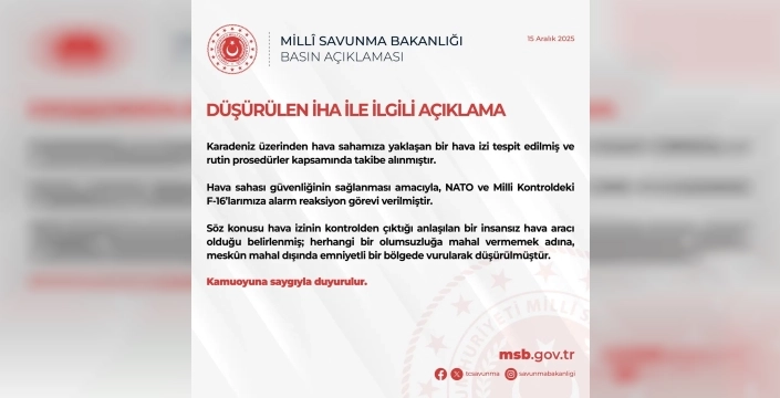 Milli Savunma Bakanlığı, Karadeniz üzerinde hava sahamıza yaklaşan bir İnsansız Hava Aracı'nın (İHA) tespit edildiğini ve kontrolden çıktığı anlaşılan aracın, yerleşim yerlerinden uzak bir bölgede vurularak düşürüldüğünü açıkladı. 15 Aralık 2025 tarihli duyuruda, radarlar tarafından izlenen hava izinin derhal takibe alındığı ve güvenlik prosedürlerinin devreye sokulduğu belirtildi.