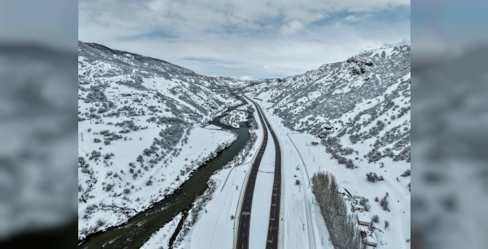Bölgeden geçen Karasu Nehri ve kara yolu, dronla çekilen görüntülerle kaydedildi. Nehir kıyısında yer yer buzlanmalar gözlemlenirken, yüksek kesimlerde sis etkili oldu. Karla kaplanan doğanın oluşturduğu manzara, izleyenleri büyüledi.