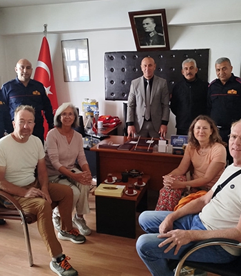 İtfaiye Müdürlüğünü ziyaret edip ekiplere teşekkür eden turistler, kurtarıldıkları itfaiye aracının sepetine yeniden binerek personel ile fotoğraf çektirdi.