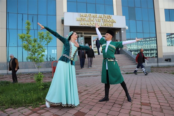 Okul çıkışında Kafkas Halk Dansı figürüyle poz veren çift, oylarını Haydar Aliyev Lisesi'nde kullandı.