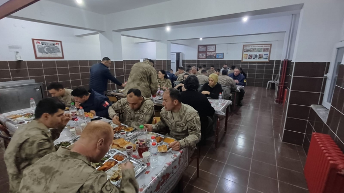 ALPARSLAN DİYARI- Malazgirt Kaymakamı Göksu Bayram ve Cumhuriyet Savcıları Pınar Özçulcu ve Hilmi Kahveci, Malazgirt Jandarma komutanlığında Jandarma Komutanı Binbaşı İlker İncebak ve jandarma personeli ile iftar sofrasında bir araya geldiler.