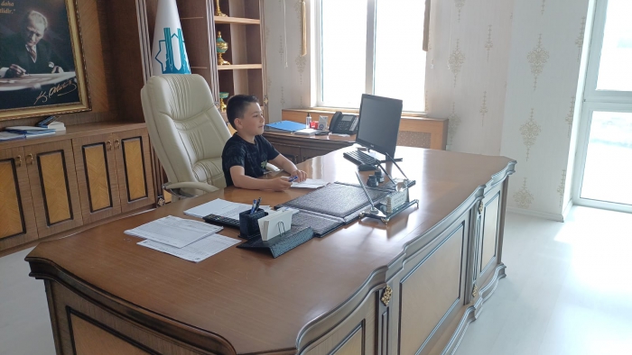 Öğrenci Hanzala Yusuf Fidan, kısa bir süreliğine kaymakam koltuğunda oturmanın heyecanını yaşarken, Kaymakam Bayram’a yönelik merak ettiği konuları sormaktan çekinmedi.