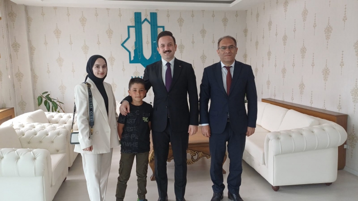 Kaymakam Göksu Bayram, kısa süreliğine koltuğuna oturan Hanzala Yusuf Fidan’a çeşitli hediyeler verdi.