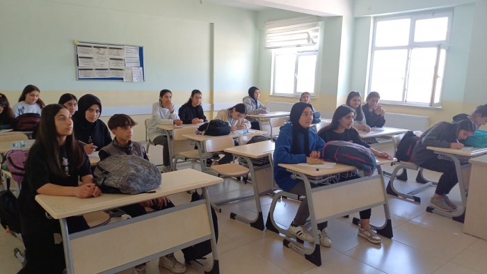 Kaymakam Bayram, Sağlık Lisesinde Yükseköğretim Kurumları Sınavı (YKS) girecek öğrencilerin genel durumları hakkında bilgiler alırken, okulda eğitim gören 9. Sınıf öğrencilerini ziyaret ederek, görüş alışverişinde bulundu.