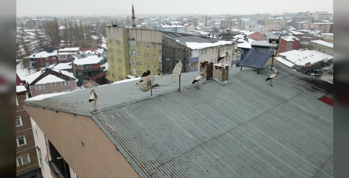 Son günlerde etkili olan yağmurla birlikte, soğuk havanın hakim olduğu kentte leyleklerin görülmesi dikkat çekti. Eski Van Caddesi'ndeki yüksek bir binanın çatısına konan 8 leylekten oluşan sürü, dron ile görüntülendi.
