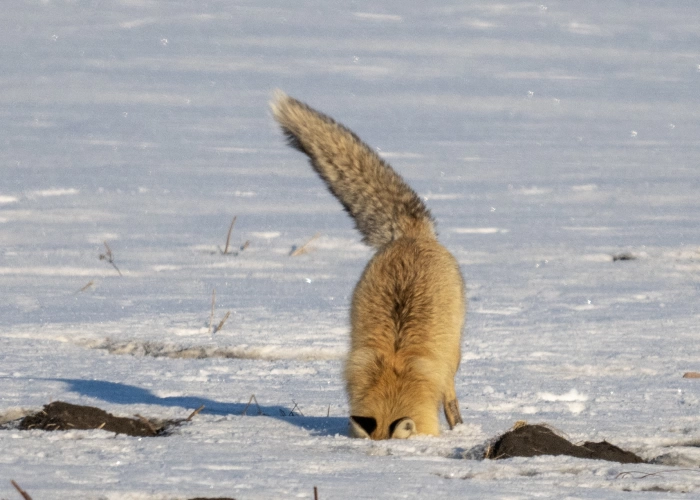 Kars-Çıldır kara yolunun karla kaplı kırsalında görüntülenen kızıl tilki, dakikalarca beyaz örtü altındaki farenin hareketlerini dinleyerek avını yakalamayı başardı.