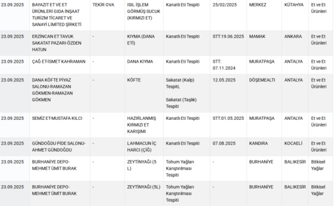 Yapılan son analizlerde, Antalya Döşemealtı'nda faaliyet gösteren Dana Köfte Piyaz Salonunda köftede kalp tespit edildi.