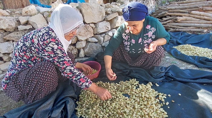 Dutları bir süre kazanlarda kaynatan köylüler, daha sonra bez torbalara koyarak süzüyor ve ortaya çıkan suyu tekrar ateşte kaynatıyor.