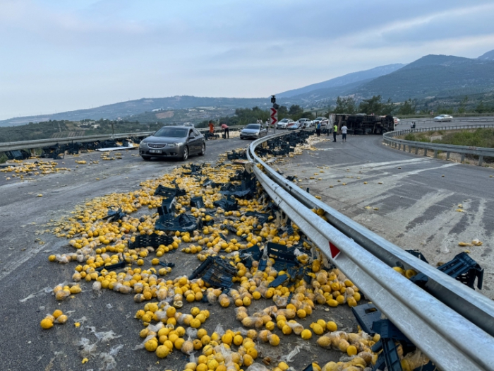 Devrilen kamyon ve yola saçılan limonlar nedeniyle kapanan yol, çalışmaların ardından trafiğe açıldı.