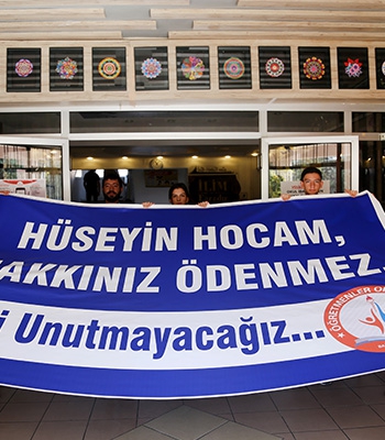 Okul bahçesinde "Hüseyin hocam hakkın ödenmez. Seni unutmayacağız" yazılı pankart açan öğrencileri gören Yıldız ise duygulandı.