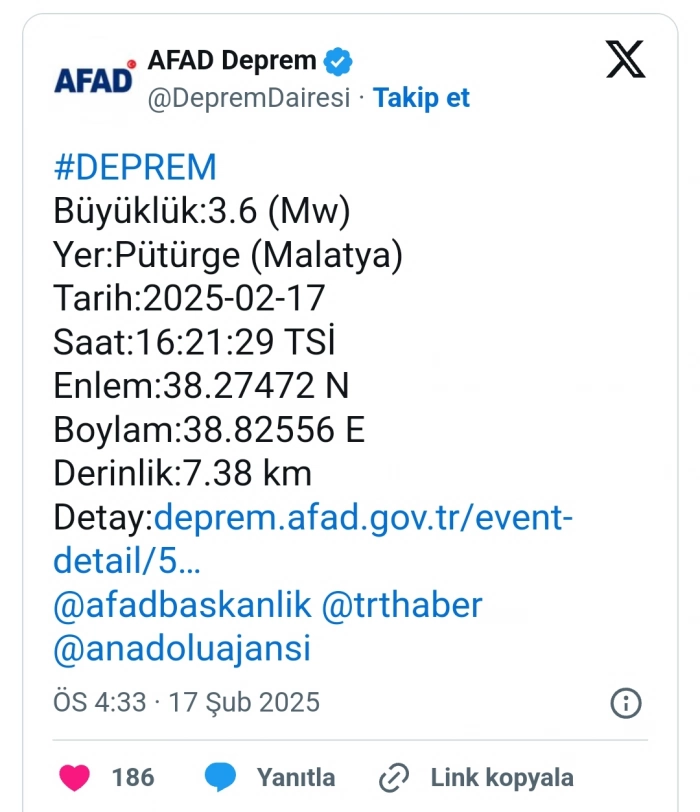 Malatya'nın Pütürge ilçesinde 3.6 büyüklüğünde deprem meydana geldi.