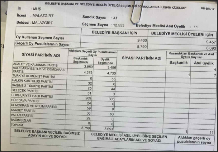 Kesin olmayan resmi sonuçlara göre Malazgirt Belediye Meclis üyelerinden 7 aday DEM Partiden kazandı. Ak Parti ise 4 aday kazandı.
