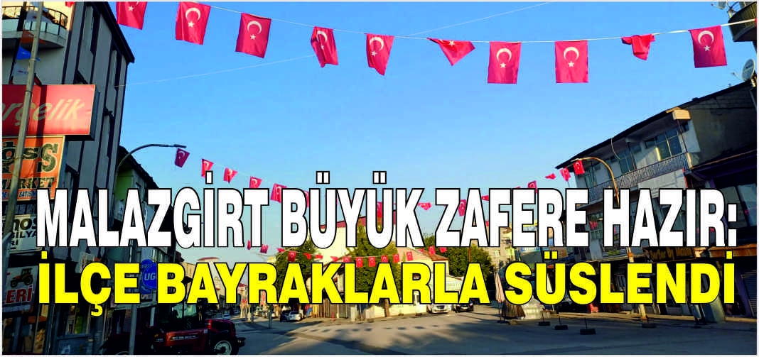 ALPARSLAN DİYARI- İlçede bu büyük zaferin coşkusu şimdiden hissedilmeye başlandı. Tüm sokaklar, caddeler ve meydanlar Türk bayraklarıyla donatıldı, Malazgirt adeta kırmızı beyaza büründü.