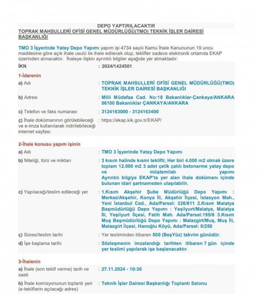 ALPARSLAN DİYARI- 27 Kasım Çarşamba günü gerçekleştirilecek ihale ile TMO depolarının ilçeye kazandırılması hedefleniyor.
