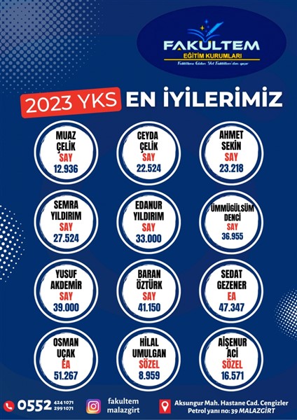 ALPARSLAN DİYARI- Malazgirt'te faaliyet gösteren Fakültem Eğitim Kurumları yine önemli dereceler çıkartarak bu yıl da YKS iddiasını sürdürdü. Önemli bir eğitim kadrosunu bünyesinde bulunduran eğitim kurumu Sayısal, Eşit Ağırlık ve Sözel de iyi dereceler çıakrtarak Malazgirtli gençlerin iyi üniversiteleri kazanmasına vesile oluyor.