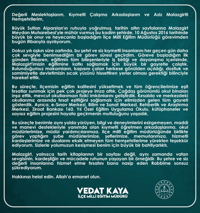 ALPARSLAN DİYARI- Kaya, yayımladığı veda mesajında, Malazgirt’te görev yapmanın kendisi için büyük bir onur olduğunu belirterek, eğitim camiasına teşekkür etti.