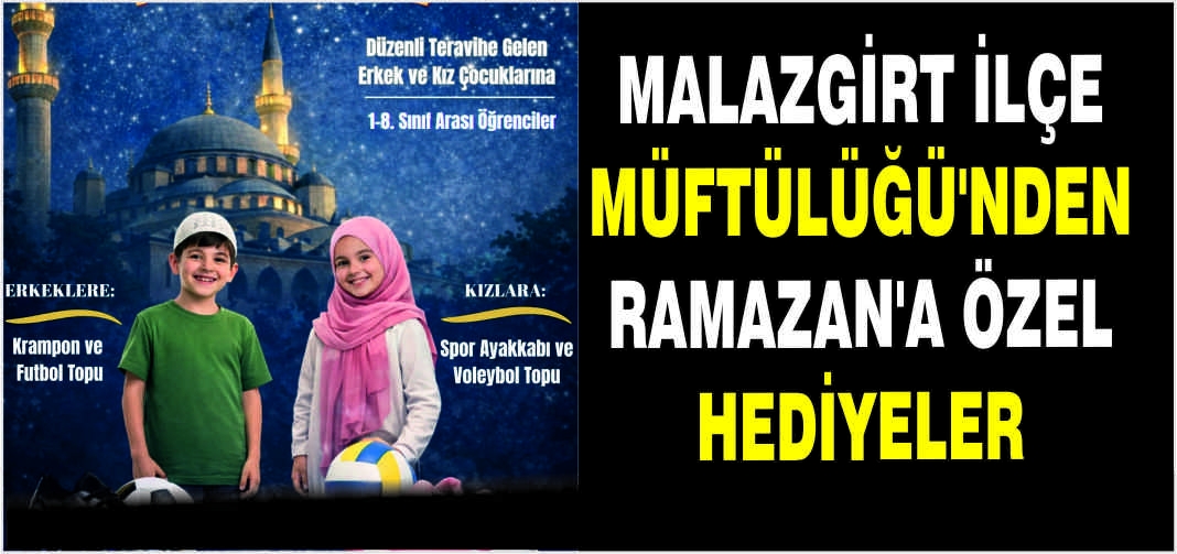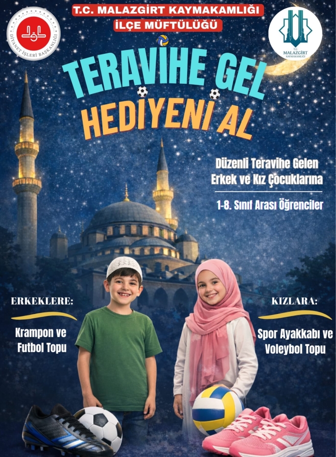 ALPARSLAN DİYARI- “Teravihe Gel Hediyeni Al” sloganıyla duyurulan kampanya kapsamında, teravih namazına düzenli katılan 1-8. sınıf arası öğrencilere çeşitli hediyeler verilecek.