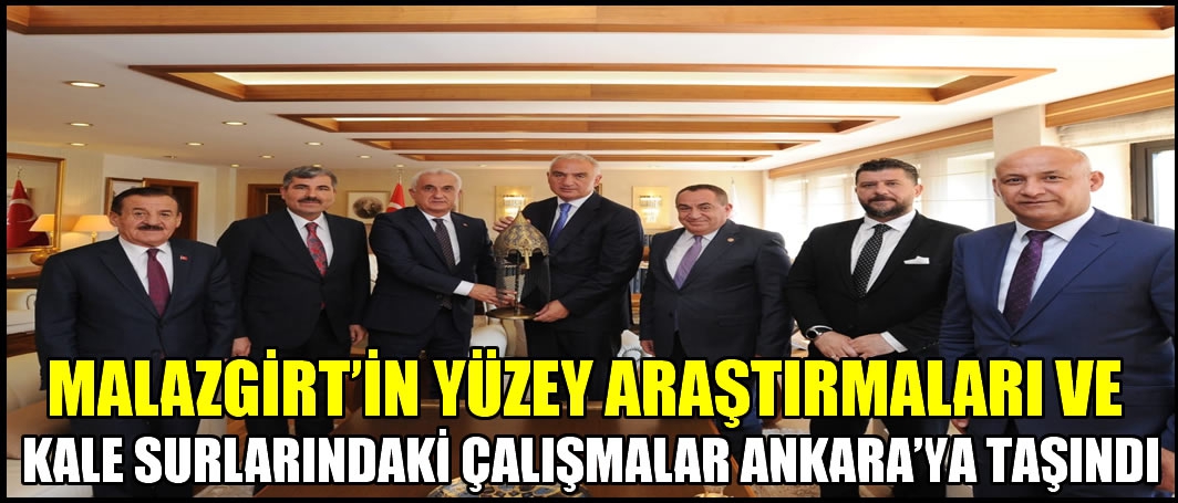 ALPARSLAN DİYARI- Muş Valisi Avni Çakır, AK Parti Muş Milletvekili Mehmet Emin Şimşek, Muş Belediye Başkanı Feyat Asya, Malazgirt Belediye Başkanı Cengiz Altın, Hasköy Belediye Başkanı Hikmet Karayel ve AK Parti Muş İl Başkanı Melik Emre’den oluşan heyet Kültür ve Turizm Bakanı Mehmet Nuri Ersoy’u ziyaret etti.