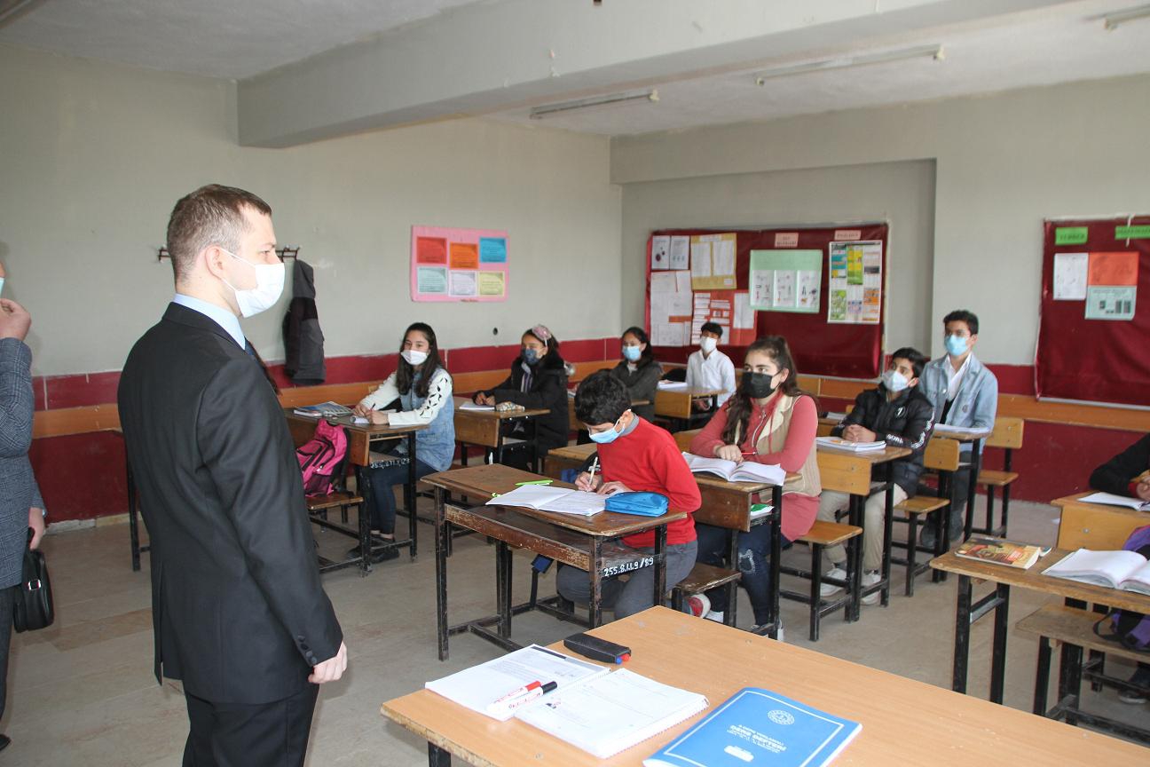 Beraberindeki İlçe Jandarma Komutanı Yüzbaşı Ahmet Uysal ve İlçe Milli Eğitim Şube Müdürü Şahin Kılıç 8 sınıflarda yüz yüze eğitime devam eden Hasretpınar Köyü İmam Hatip Ortaokulunu ziyaret etti.