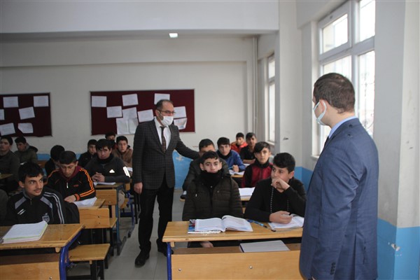 Malazgirt Kaymakamı Yiğit Yaşar Demirer, Milli Eğitim Müdürü Vedat Kaya ile yüz yüze eğitim yapılan lisede incelemelerde bulundu.
