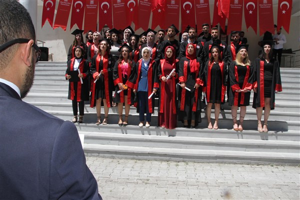 Üniversitenin Konferans salonunda düzenlenen mezuniyet töreni, saygı duruşunda bulunulması ve İstiklal Marşı'nın okunmasıyla başladı.