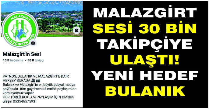ALPARSLAN DİYARI- Yöneticiler,” Değerli takipçilerimiz, yoğun ilginizden dolayı teşekkür ederiz. Malazgirt Sesi sayfamız 30 bin takipçi sayısına ulaşarak Malazgirt ve Bulanık ilçelerimizin en büyük sosyal medya yerel haber sayfası olmuştur.
