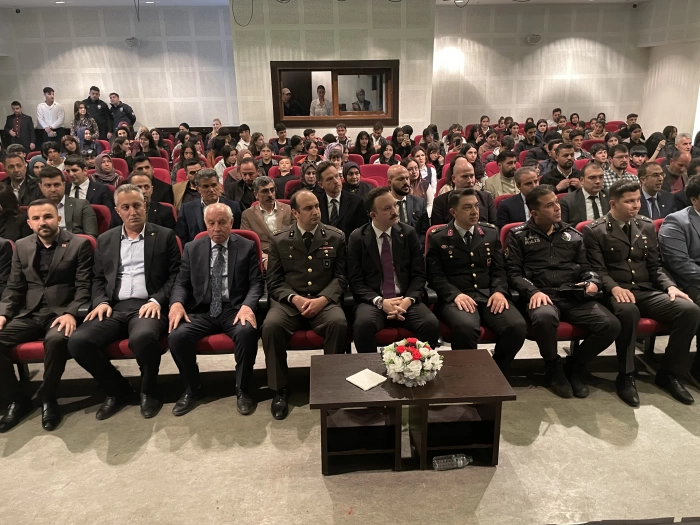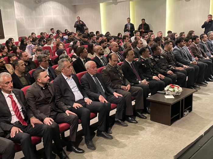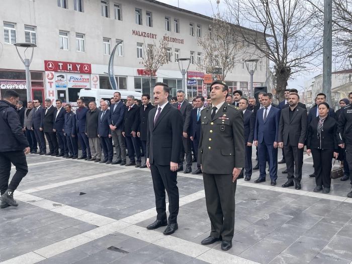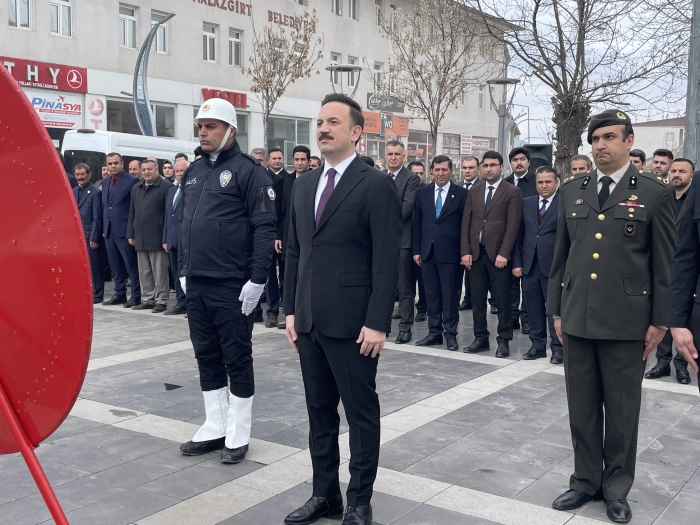 ALPARSLAN DİYARI- Cumhuriyet Meydanı'ndaki Atatürk büstüne çelenklerin sunulması, saygı duruşu ve İstiklal Marşı'nın okunmasıyla başlayan tören, Malazgirt Kültür Merkezi Konferans Salonunda devam etti.