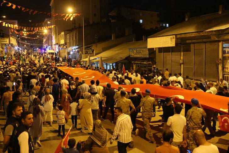 Şehit Binbaşı Arslan Kulaksız Caddesi'nde toplanan vatandaşlar, açtıkları 200 metre uzunluğundaki Türk bayrağı ve yaktıkları meşalelerle Cumhuriyet Meydanı'na kadar yürüdü.