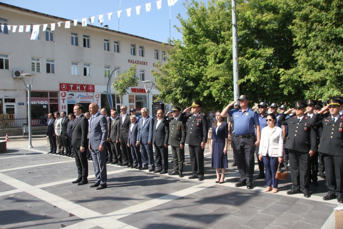Çelenk koyma törenine Malazgirt Kaymakamı Göksu Bayram, Belediye Başkanı Cengiz Altın, Cumhuriyet Savcısı Pınar Özçulcu, Jandarma Komutanı Binbaşı Kamil İncebacak, Emniyet Müdürü Serhan Türk, Milli Eğitim Müdürü Vedat Kaya, siyasi parti temsilcileri, STK’lar, kurum amirleri, askeri erkân katıldı.