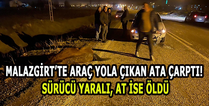 Kaza, akşam saatlerinde Malazgirt- Bulanık karayolu üzerinde meydana geldi. Edinilen bilgiye göre 49 AN 113 plakalı otomobil seyir halindeyken bir anda yola atlayan başıboş ata çarptı. Ata çarpan araç kullanılamaz hale gelirken, sürücü ise hafif yaralı şekilde kurtuldu. At ise olay yerinde telef oldu.