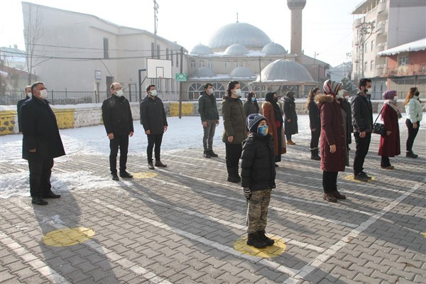 Milli Eğitim Bakanlığı'nın (MEB) ülke genelinde eş zamanlı olarak gerçekleştirdiği uygulama kapsamında Muş’un Malazgirt ilçesinde saat 10.00’da okul bahçelerinde bayrak töreni düzenlenip İstiklal Marşı okundu.