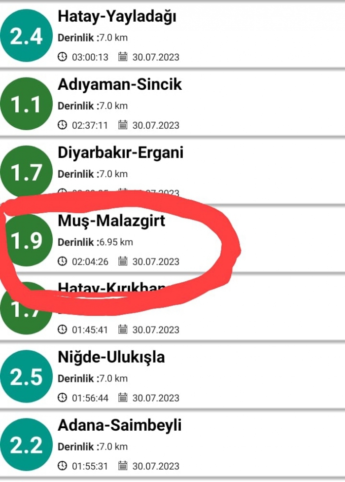 Afet ve Acil Durum Yönetimi Başkanlığı (AFAD) tarafından paylaşılan verilere göre, 30 Temmuz Pazar günü Muş İli Malazgirt ilçesinde saat 02:04'de bir deprem meydana geldi.