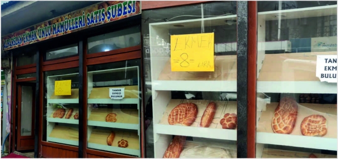 Fırın önüne asılan duyuruda “1 ekmek 8 TL” ifadesi dikkat çekerken, ayrıca tandır ekmeği satışı da yapıldığı görüldü.