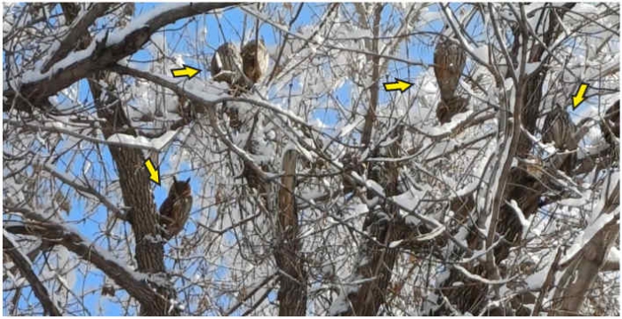 Kaymakamlık bahçesindeki az sayıda ağaç üzerinde görülen baykuşlar, gece avı için dinlenerek, kamufle olmaya çalıştılar.