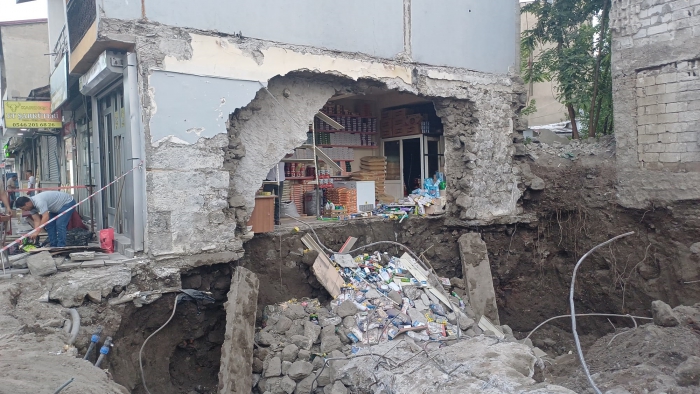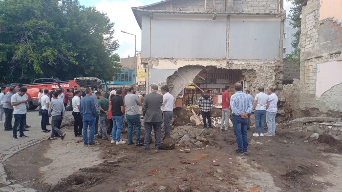 ALPARSLAN DİYARI-Eski belediye çay bahçesi karşısında bulunan Nuri ve Birol Alkan'a ait iş yeri, yan tarafta yapılan kazı çalışmaları sırasında aniden yıkıldı. İş yerinin yan duvarı, yan tarafındaki eşyalarla birlikte inşaat kazı alanına döküldü.