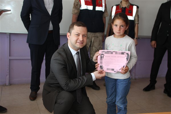 Yaramış İlk ve Ortaokulunda öğrencilere karnesini veren Kaymakam Demirer, dersleri iyi olan öğrencileri tebrik ederken, notları düşük olan öğrencilere başarılı olmaları konusunda nasihatlerde bulundu.