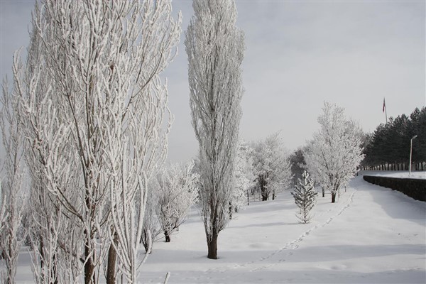 Malazgirt’te soğuk havalarda oluşan kırağı, ilçe merkezi ve Tarihi Milli Parkta kartpostallık görüntüler oluşturdu.