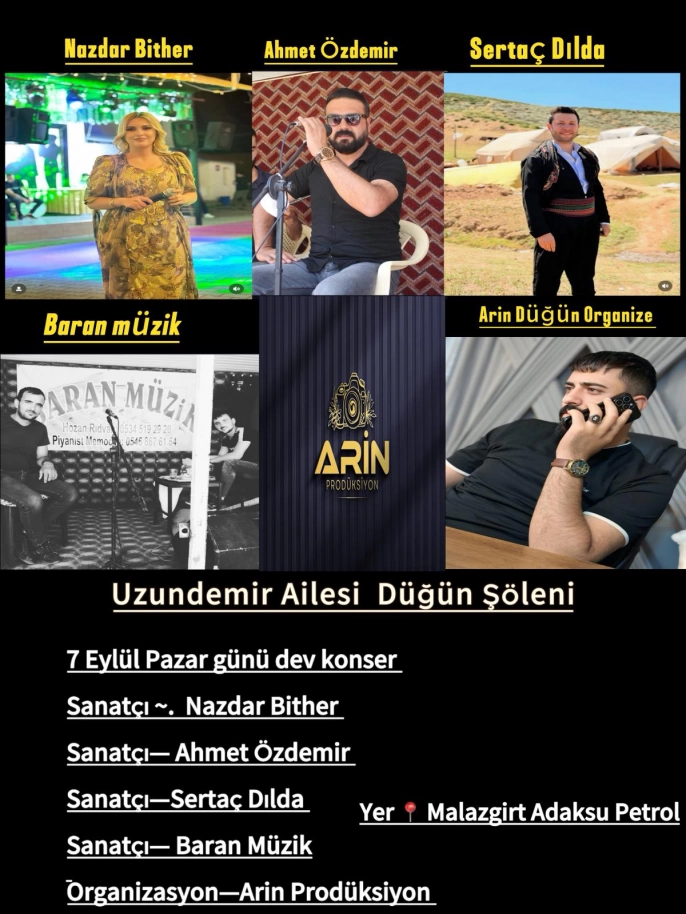 “Malazgirt halkımız her zaman sanatı ve sanatçıyı bağrına basmıştır. Biz de bu büyük organizasyonda birbirinden değerli sanatçılarımızı hemşehrilerimizle buluşturmanın mutluluğunu yaşıyoruz. Düğün şölenimizi bir konsere dönüştürerek halkımıza unutulmaz bir gün yaşatmayı hedefliyoruz.”