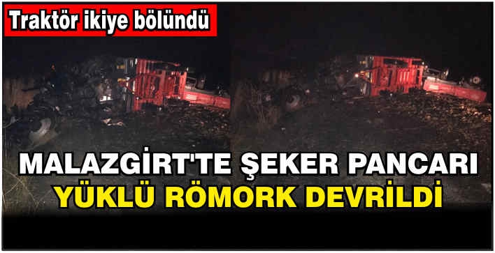 ALPARSLAN DİYARI-Malazgirt Konakkuran beldesi karayolunda R.K. hâkimiyetindeki Traktör yolda hâkimiyetini kaybedince şeker pancarı dolu römorkuyla birlikte devrildi.