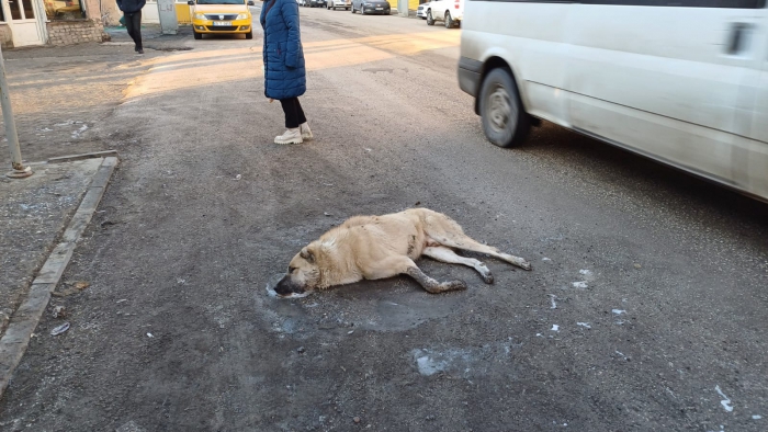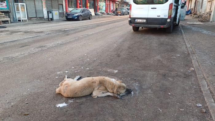 Malazgirt Bulanık caddesinde işe giden vatandaşlar yolun ortasında ölmüş köpeği görünce belediye ekiplerine haber verdiler.
