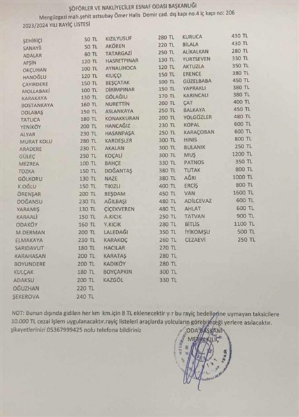 Güncellenen tarife ile birlikte Malazgirt’te mahalleler artık 40 TL olacak. İlçe en uzak köyler ise 450 TL olarak belirlendi.