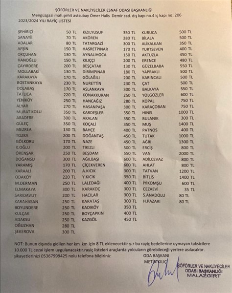 Malazgirt’te taksi ücretleri zammı ile ilgili paylaşımda bulunan Malazgirt Şoförler ve Nakliyeciler Esnaf Odası Başkanlığı Ocak ayından itibaren geçerli olacak yeni tarifeyi açıkladı