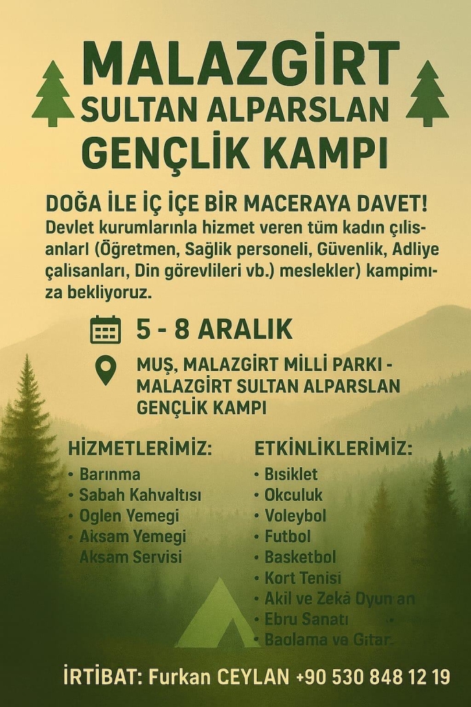 ALPARSLAN DİYARI- Malazgirt Milli Parkı’nın eşsiz doğasında gerçekleştirilecek kamp, devlet kurumlarında görev yapan tüm kadın çalışanları doğa ile iç içe bir maceraya davet ediyor.
