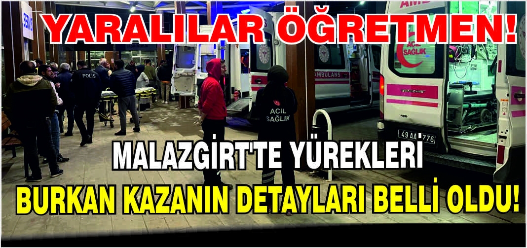 Yetkililerden aldığımız bilgilere göre Konakkuran Beldesinde görev yapan öğretmenleri taşıyan aracın, Konakkuran- Malazgirt yolunda kontrolden çıkarak takla attı. Araçta bulunan 6 öğretmen ile araç sürücüsü yaralandı. Kaza sonra İlçe Milli Eğitim Müdürü Mustafa Tek ve Şube Müdürleri hastaneye gelerek yetkililerden bilgi aldı. Yaralıların genel sağlık durumlarının iyi olduğu belirtildi.