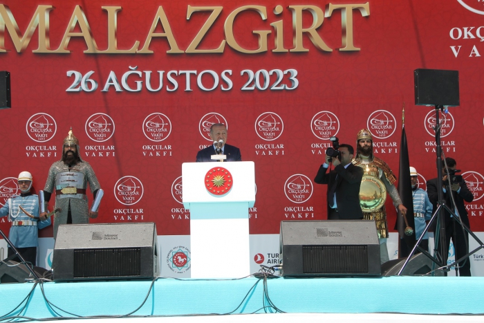 “Bugün Malazgirt Zaferi'nin 952. yıl dönümü vesilesiyle tarihimizin önemli dönüm noktalarından birine şahitlik eden şu mübarek topraklarda tekrar bir aradayız. Sözlerimin hemen başında Anadolu'yu bizlere vatan haline getiren tüm kahramanlarımızı, şehitlerimizi, gazilerimizi, gönül sultanlarımızı rahmetle, şükranla yad ediyorum. Sultan Alparslan'ın ve ordusunda yer alan her bir neferin bize emaneti olan bu toprakları kanımızın son damlasına kadar koruma azim ve kararlılığımızı buradan bir kez daha ilan ediyoruz. Şu hakikat asla unutulmamalıdır ki, Malazgirt öyle sıradan bir savaş, sıradan bir zafer değildir.
